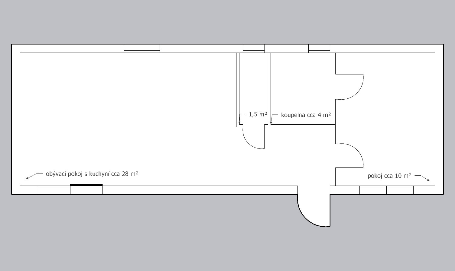 Rozvržení: 1 ložnice, obývací pokoj s kuchyňským koutem, koupelna, 2 WC