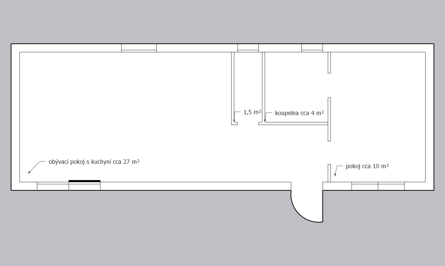 Rozvržení: 1 ložnice, obývací pokoj s kuchyňským koutem, koupelna, 2 WC