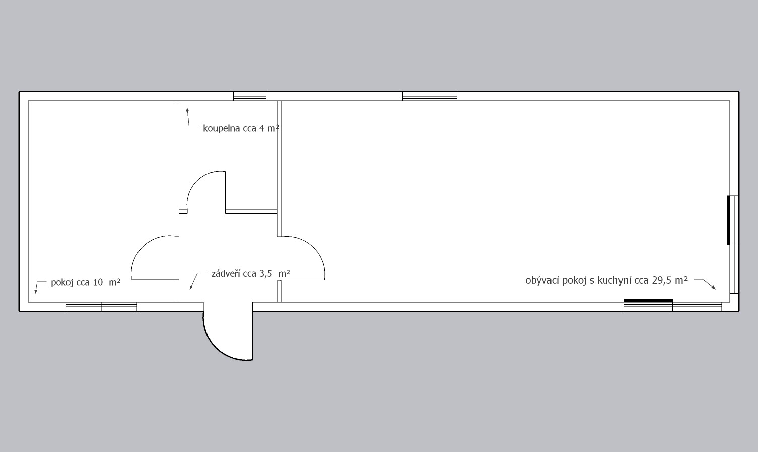 Rozvržení: 1 ložnice, obývací pokoj s kuchyňským koutem, koupelna, WC