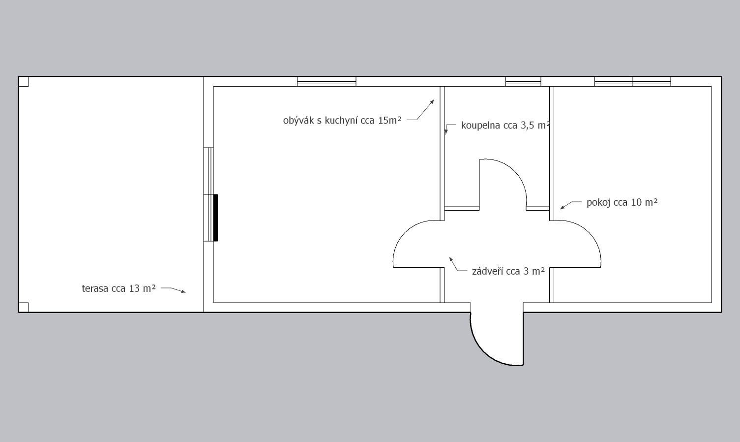 Rozvržení: 1 ložnice, obývací pokoj s kuchyňským koutem, koupelna, WC, terasa