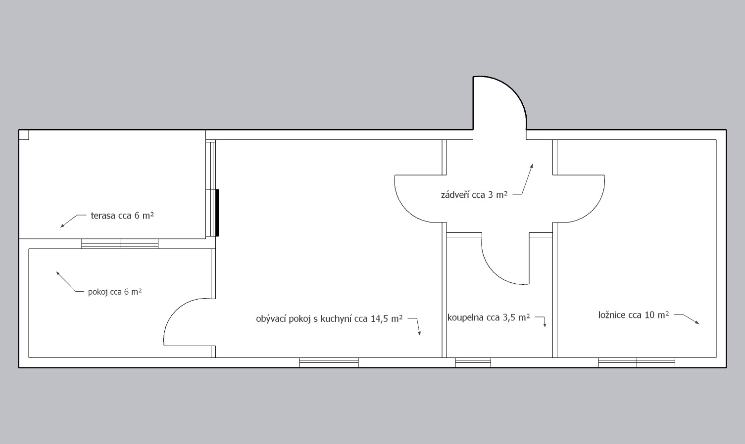 | Rozvržení: | 2 ložnice, obývací pokoj s kuchyňským koutem, koupelna, WC, terasa |