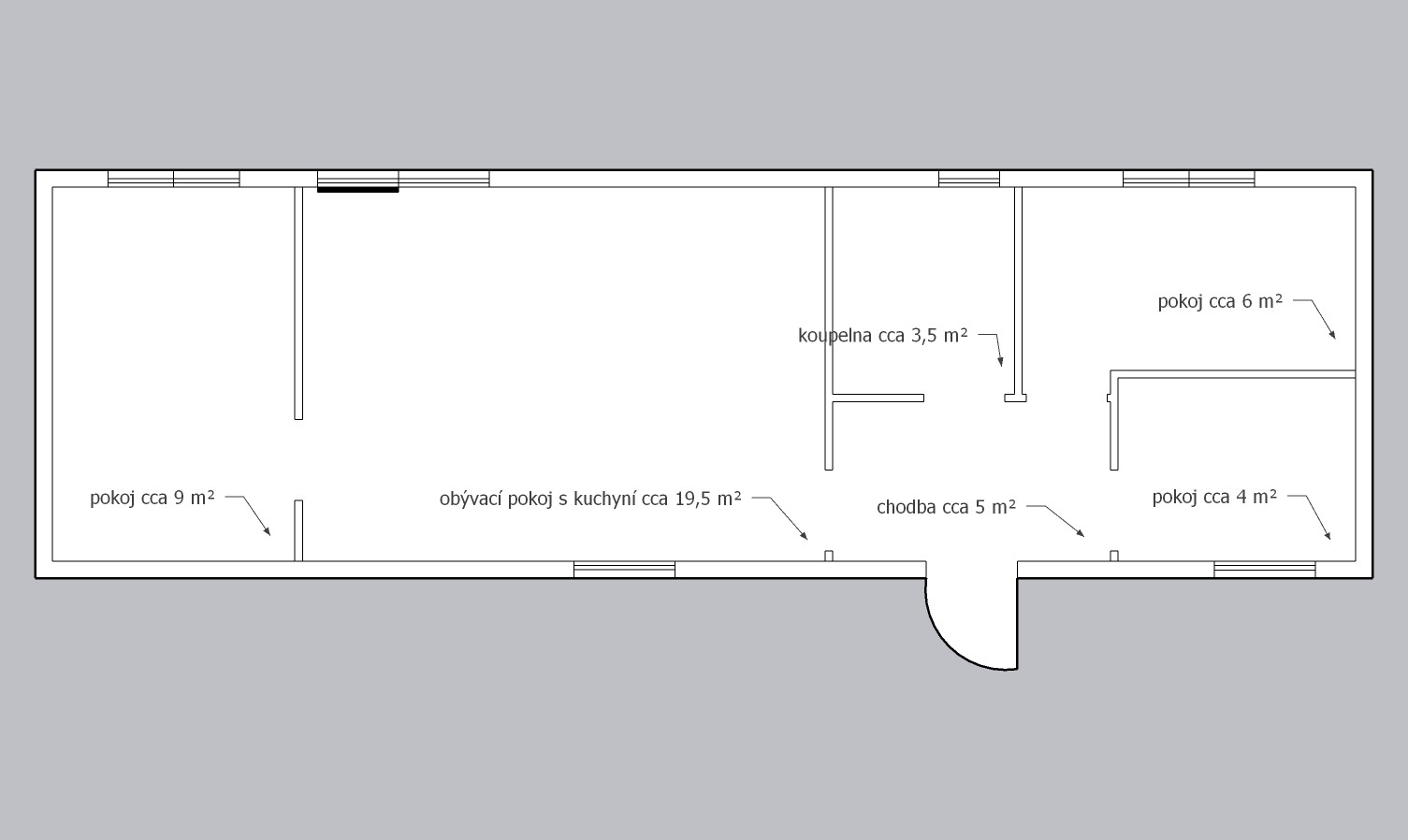 Rozvržení: 3 ložnice, obývací pokoj s kuchyňským koutem, koupelna, WC