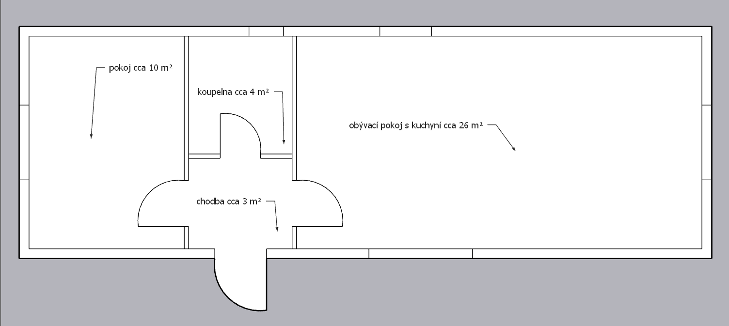 Rozvržení: 2 ložnice, obývací pokoj s kuchyňským koutem, koupelna, WC